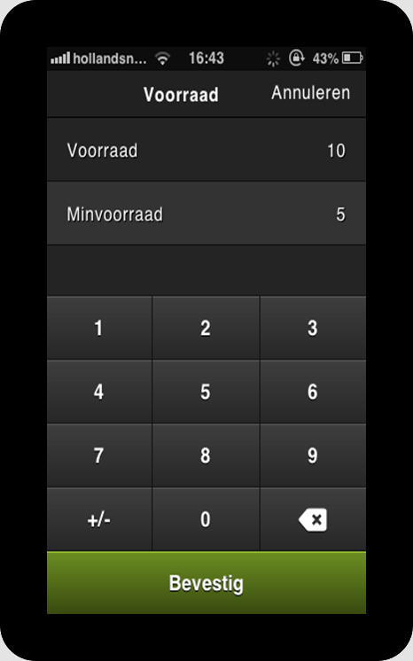 Op een willekeurige device ga je naar het product dat uit voorraad dreigt te lopen en houdt de knop van het product ingedrukt. Er verschijnt dan een pop-up menu en je klikt op ‘voorraad’. Binnen het invulscherm voer je de actuele en minimumvoorraad in. De signalering wordt geactiveerd op moment de minimumvoorraad is bereikt. En de actuele voorraad wordt vanaf dat moment real-time bijgewerkt.