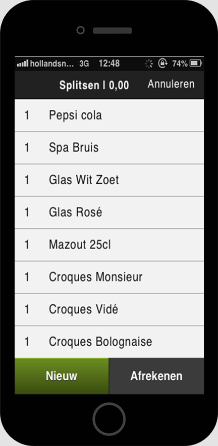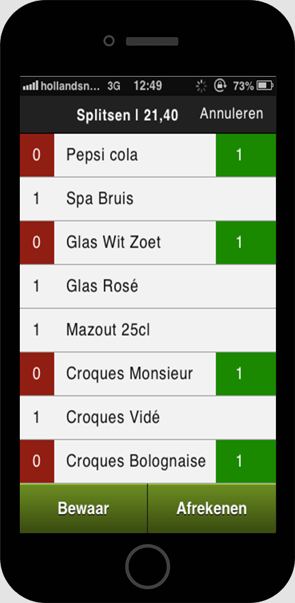 Je opent een tafel en selecteert de functie ‘splitsen’. En klikt op de producten die apart dienen te worden afgerekend. Nu heb je de mogelijkheid om dit deel van de rekening direct af te rekenen.